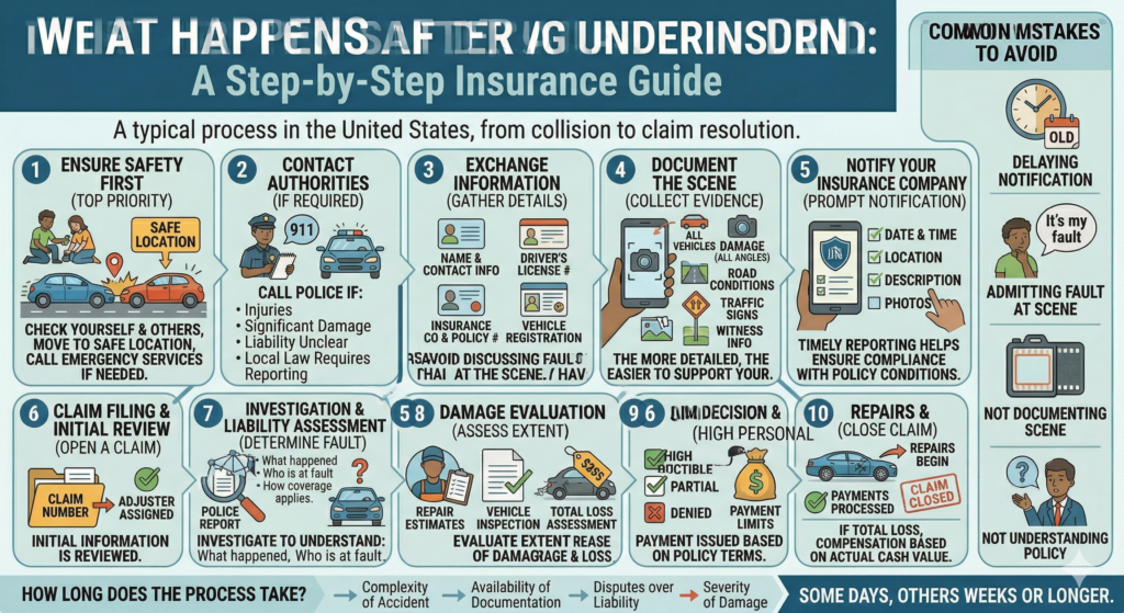 This guide explains the typical process in the United States, from the moment the accident occurs to the resolution of an insurance claim.